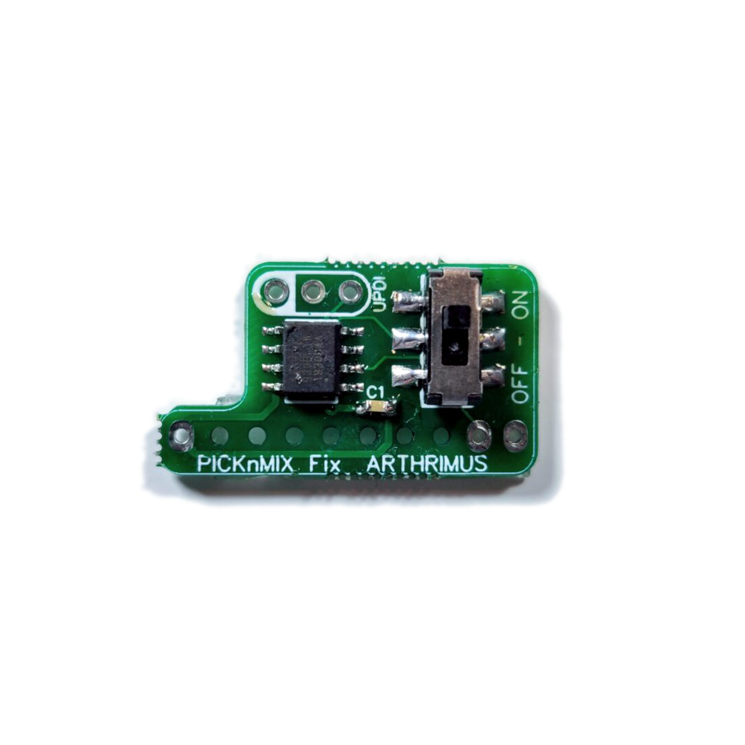 The PICKnMIX Fix is a simple PCB that automatically enables the Universe Bios V4 PICKnMIX mode for 161 in 1 multicarts. When switched on the PICKnMIX fix will automatically press start for a couple of seconds during the startup screen so PICKnMIX will automatically be enabled. This is convenient if you use a 161 in 1 cart, but you don’t want to mess with enabling PICKnMIX manually every time you use it. When switched off the PICKnMIX Fix does not press start during the startup screen of the NEO-GEO.